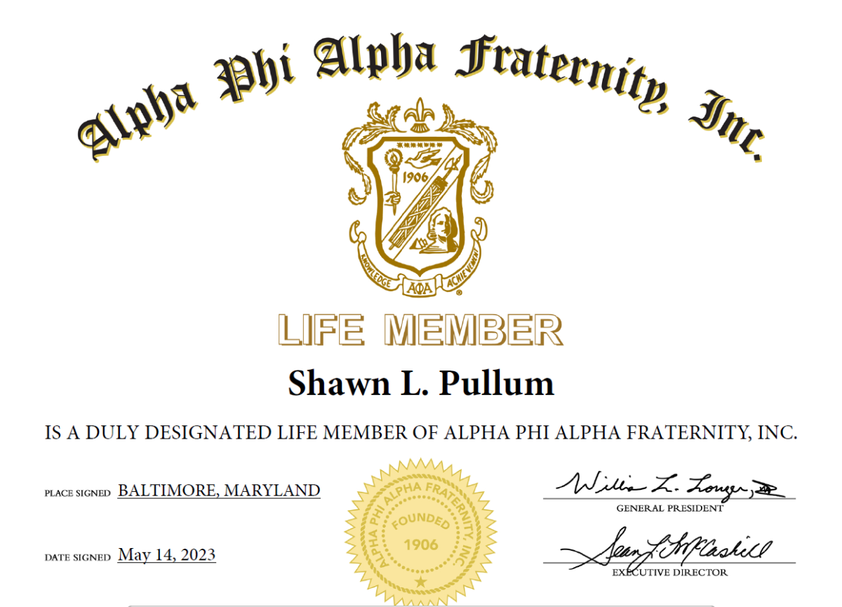 New opportunities to serve were presented to me in November of 2021, when the brothers of Alpha Phi Alpha Fraternity, Inc, Alpha Sigma Lambda Chapter, saw fit to open the door to the House of Alpha, and About Phace was eternally Phrozen therein. I have been working since that time to live up to the lofty aims, mission, and objectives of Alpha Phi Alpha, as my Alpha resume shows. I know, however, that this is just the tip of the iceberg, and that I have a long way to go in achieving my goals, in my love of all mankind, and to be a better servant of all.